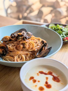 ミケルのスパイスご飯🍚今回はパスタランチ: -シーフードとオリーブのトマトパスタ🫒🍝🦪-旬野菜のポタージュ🍲-… 続きを読む: 梺base でワンデイシェフしました。 - 梺base でワンデイシェフしました。